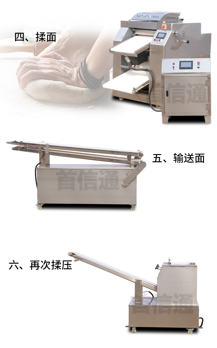 全自動饅頭生產(chǎn)線的工作原理:和面機將和好的面倒到整形輸送機平板輸送上,平板輸送將面輸送至整形輸送機預(yù)壓壓面輥處,將面壓成寬度、厚度均勻的面塊,面塊經(jīng)爬升輸送帶輸送至切刀(滾刀)處,切刀滾動將大面塊切割成大小一致的小面塊,小面塊被輸送進全自動連續(xù)壓面機里進行折疊壓面,壓夠設(shè)定遍數(shù)之后將面分割成兩條寬度一致的面帶,輸送到全自動輸送機雙輸送帶上,兩條輸送帶在程序和感應(yīng)器的控制下進行輪流連續(xù)輸送,面帶被輸送至刀切方饅頭機進行饅頭成型,也可連接仿生圓饅頭機進行圓饅頭成型,增加饅頭擺盤機可將成型后的饅頭自動擺到蒸盤中。? 特注:圓饅頭生產(chǎn)線就是在方饅頭生產(chǎn)線的基礎(chǔ)之上多加了一個方轉(zhuǎn)圓機器。?